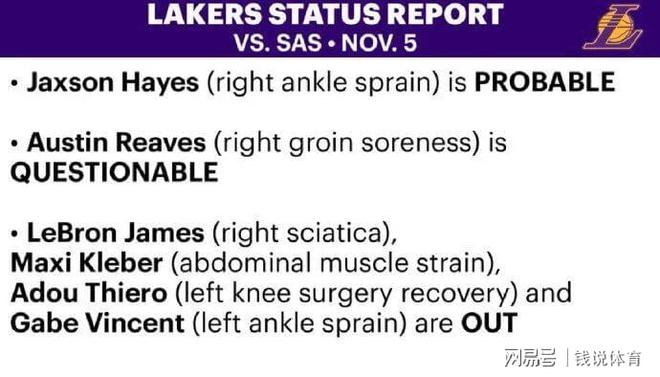 不过湖人也面临不小的伤病困扰,后卫里夫斯因右侧腹股沟酸痛,出战状态被标注为“出战成疑”,能否登场仍需赛前进一步评估;而球队核心詹姆斯则将继续因右侧坐骨神经痛缺席,据此前消息,詹皇预计要到11月中旬才能重返赛场。除此之外,克勒贝尔(腹部肌肉拉伤)、蒂耶罗(左膝手术恢复)以及文森特(左脚踝扭伤)也将因伤无缘本场对决,这对湖人的阵容深度提出了不小的考验。