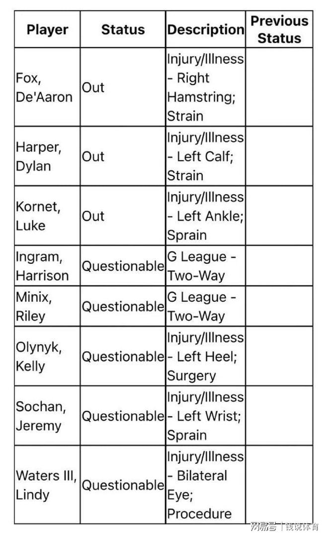 马刺方面的伤病情况同样不容乐观,球队已有3名球员确定缺席,分别是福克斯、榜眼秀哈珀以及科内特,其中哈珀是新晋伤病球员,此次因左小腿拉伤无法登场,他的缺席将影响马刺的年轻阵容轮换。更值得注意的是,马刺还有5名球员处于“出战成疑”状态,包括英格拉姆、米尼克斯、奥利尼克、索汉和沃特斯,这5名球员的出战情况将直接决定马刺本场的阵容厚度。