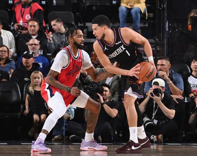 反观太阳在杜兰特交易中得到杰伦格林,在首秀中打出很惊艳的表现,仅出场23分钟就砍下29分,加上布克本赛季的效率回暖,场均30.2分,50.8%的投篮命中率和43.1%的3分命中率都来到生涯最高水准。如果两人能延续出色的表现,太阳指不定能依靠布克和格林的组合实现崛起。此役,哈登复出、狄龙复出。快船的首发是哈登、比尔、邓恩、琼斯以及祖巴茨,太阳的首发则是布克、格林,阿伦、狄龙、威廉姆斯。首节比赛开打,阿伦3分,狄龙造犯规罚球2中1,马威抛投,邓恩造犯规罚球,太阳打出8-2的开局。首节打了2分多钟,哈登造犯规罚球打破快船得分荒,而后格林中投打进,哈登顶翻阿伦中投也中,布克命中跳投后,哈登回敬3分。随后,两队你来我往陷缠斗,太阳始终保持6分领先。首节末段,大洛内线连打太阳两球,科林斯强攻篮下也打进,快船刚起势,布克就打进2+1,克里斯蒂补篮命中,奥尼尔回敬3分。场上也出现意外,格林腿部遭遇伤病,被搀扶出场,首节打完太阳35-29领先快船。